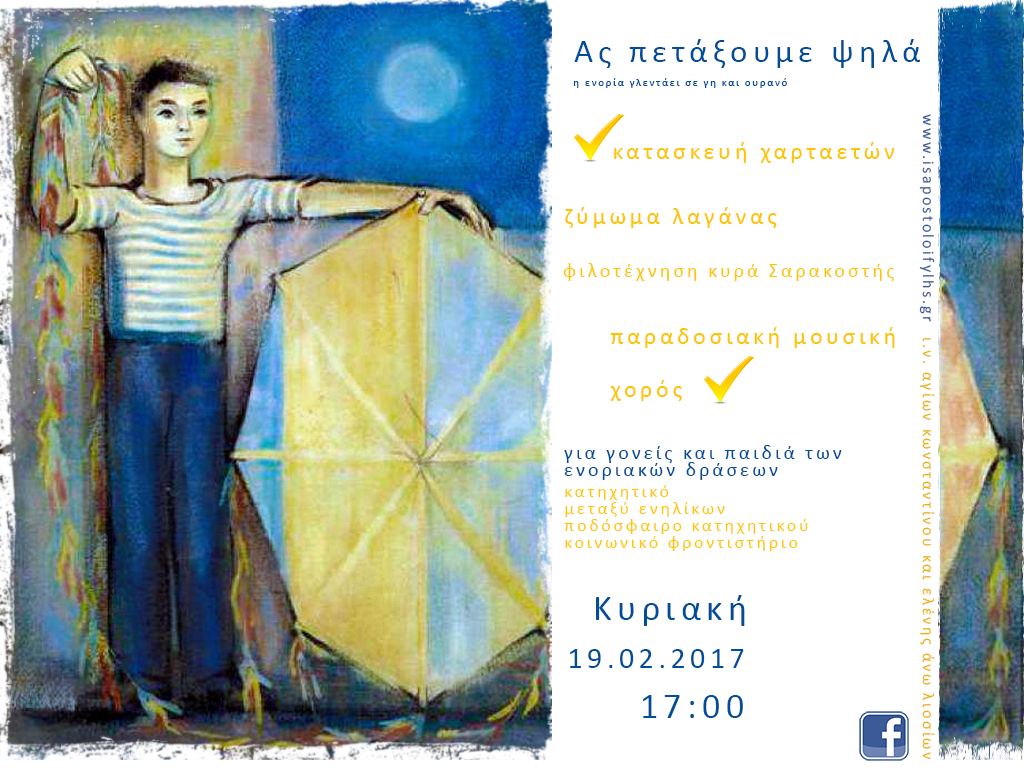 Γονείς και παιδιά του Μεταξύ Ενηλίκων, του Κατηχητικού, του Ποδοσφαίρου Κατηχητικού και του Κοινωνικού Φροντιστηρίου οδηγούμε τα βήματά μας στο προσαρακοστιανό συναπάντημα της ενορίας μας και "Πετάμε ψηλά" στο πνευματικό κέντρο του Ι.Ν. Αγίων Κωνσταντίνου & Ελένης Άνω Λιοσίων, την Κυριακή 19 Φεβρουαρίου 2017, στις 17:00.