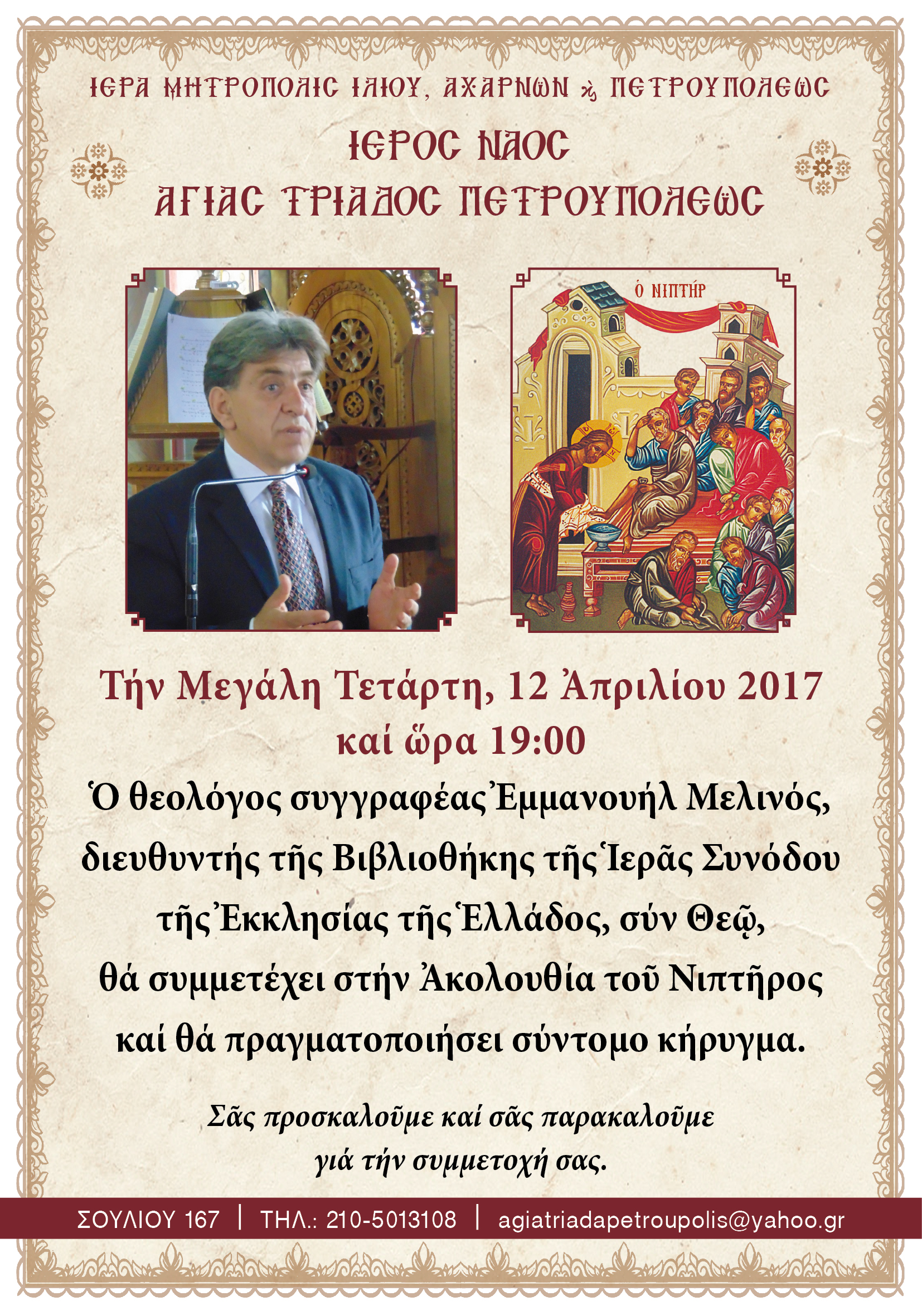 Ο θεολόγος/συγγραφέας Εμμανουήλ Μελινός, διευθυντής της Βιβλιοθήκης της Ιεράς Συνόδου της Εκκλησίας της Ελλάδος θα ψάλει στην Ακολουθία του Νιπτήρος και θα πραγματοποιήσει σύντομο κήρυγμα.