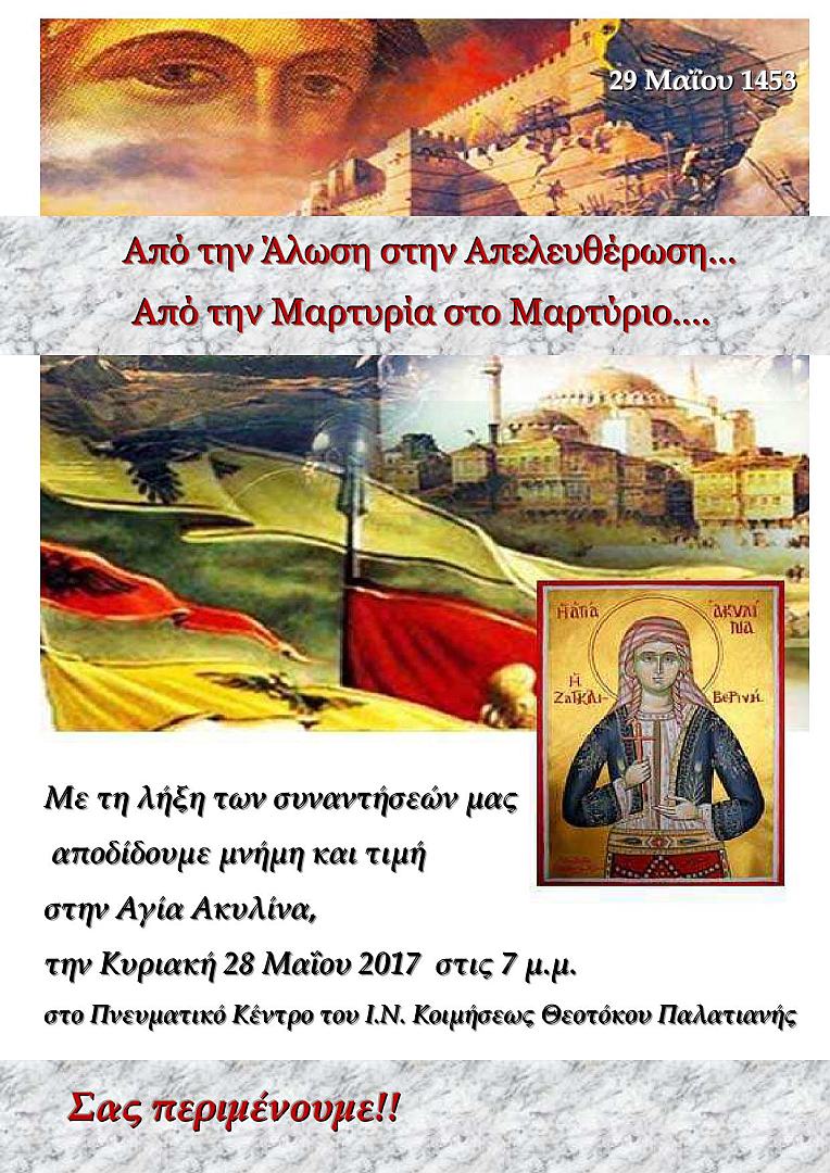 Μία ημέρα πριν την 564η επέτειο από την άλωση της Κωνσταντινουπόλεως η ενορία της Κοιμήσεως Θεοτόκου Παλατιανής Ιλίου τιμά την Αγία Ακυλίνα τη Ζαγκλιβερινή, σε μία εκδήλωση με τίτλο: