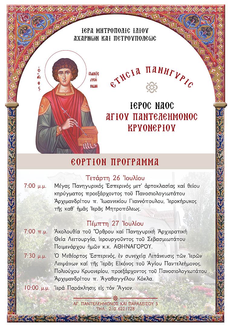 Πανηγυρίζει ο Ιερός ενοριακός Ναός Αγ. Παντελεήμονος Κρυονερίου, το διήμερο 26 και 27 Ιουλίου 2017, σύμφωνα με το ακόλουθο πρόγραμμα: