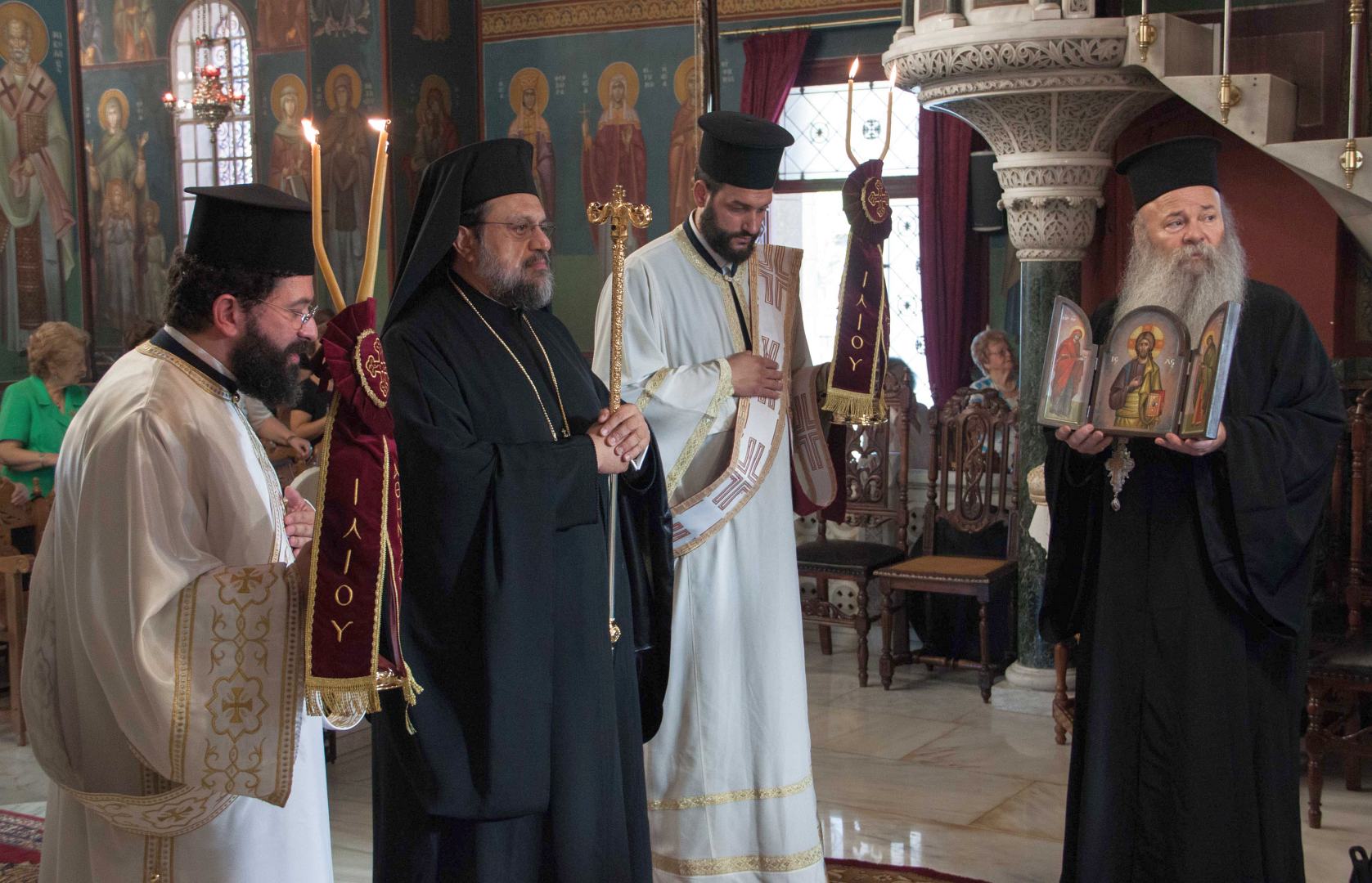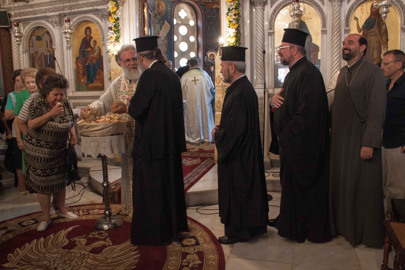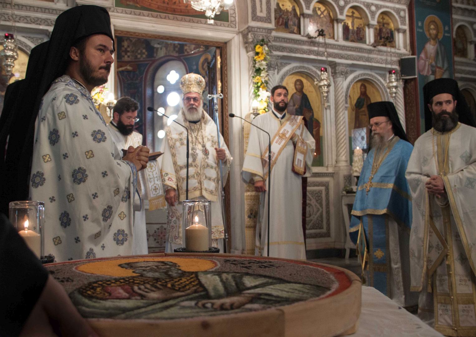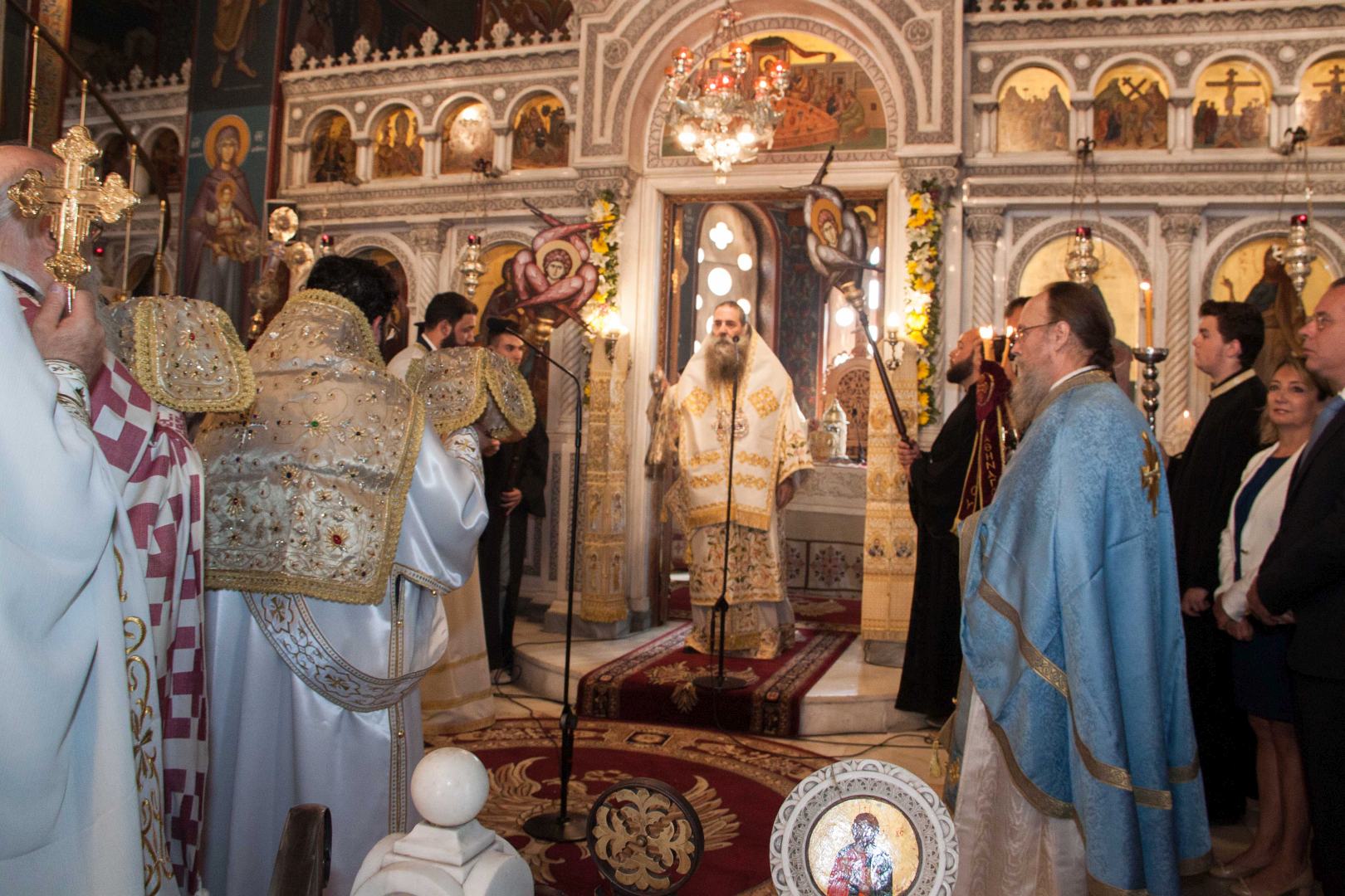Στον Όρθρο χοροστάτησε ο Μητροπολίτης Μεσσηνίας κ. Χρυσόστομος ενώ στη Θεία Λειτουργία προεξήρχε ο Μητροπολίτης Ιλίου, Αχαρνών και Πετρουπόλεως κ. Αθηναγόρας, συλλειτουργούντων των Μητροπολιτών Πειραιώς κ. Σεραφείμ, Ηλιουπόλεως Αιγύπτου κ. Θεοδώρου, Μεσσηνίας κ. Χρυσοστόμου, Κηφισίας κ. Κυρίλλου, Ν. Ιωνίας κ. Γαβριήλ, Θεσσαλιώτιδος κ. Τιμοθέου, και των Επισκόπων Σαλώνων κ. Αντώνιου και Μεθώνης κ. Κλήμεντος. Συμπροσευχόμενοι παρέστησαν οι Μητροπολίτες Δημητριάδος κ. Ιγνάτιος και Πτολεμαϊδος κ. Εμμανουήλ, ενώ προσήλθε να ευχηθεί και ο Μητροπολίτης Αρκαλοχωρίου κ. Ανδρέας.