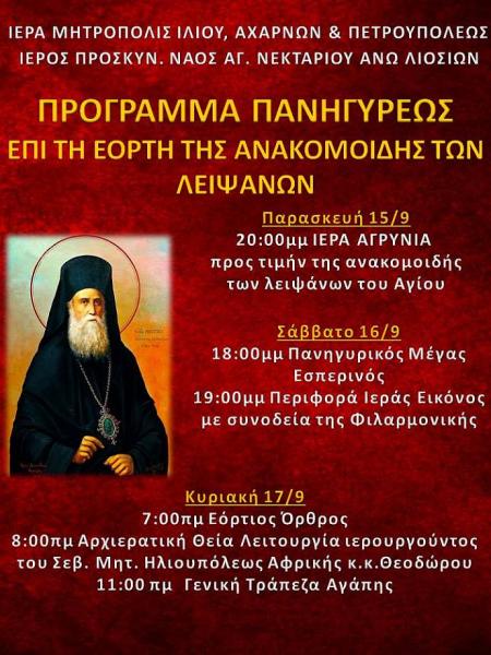 Ο Ιερός Προσκυνηματικός Ναός Αγίου Νεκταρίου Άνω Λιοσίων πανηγυρίζει την εορτής της ανακομιδής των ιερών λειψάνων του προστάτη του, Αγίου Νεκταρίου, Επισκόπου Πενταπόλεως.