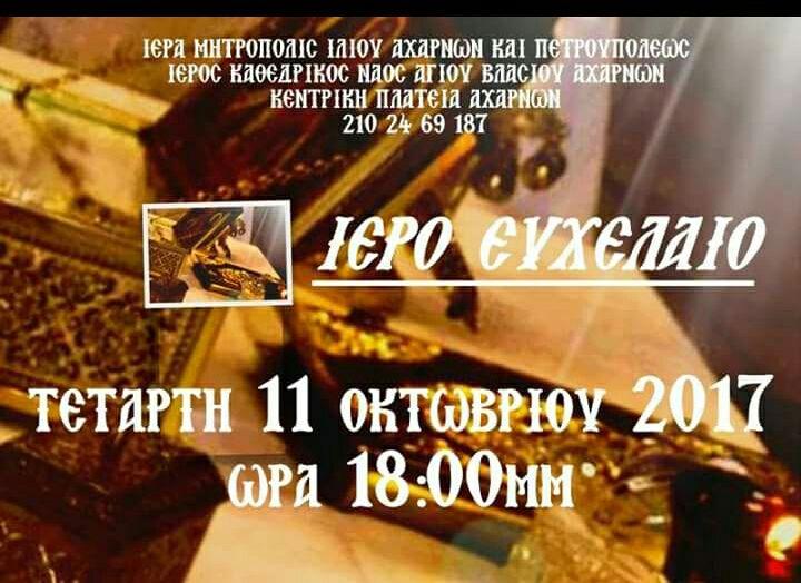 Ιερό Ευχέλαιο θα τελεστεί στον Ι.Ν. Αγίου Βλασίου Αχαρνών την Τετάρτη 11 Οκτωβρίου 2017, στις 6 το απόγευμα.