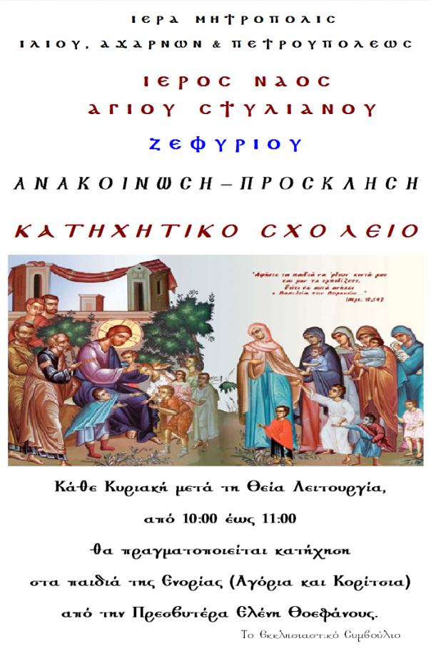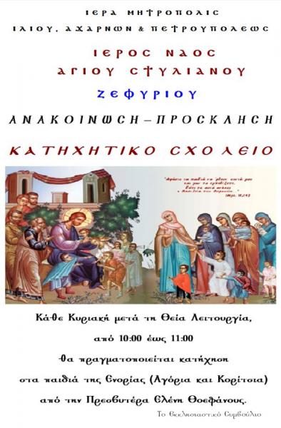 Στον Ι.Ν. Αγ. Στυλιανού Ζεφυρίου, κάθε Κυριακή μετά τη Θ. Λειτουργία (10 π.μ.-11 π.μ.), θα πραγματοποιούνται κατηχητικές συνάξεις για παιδιά.