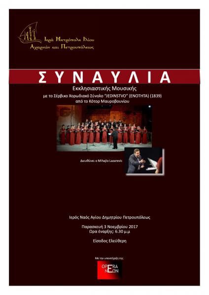 Το σερβικό χορωδιακό σύνολο "Jedinstvo 1839" (Ενότητα) από το Κότορ Μαυροβουνίου θα δώσει συναυλία στον Ιερό Ναό Αγίου Δημητρίου Πετρουπόλεως, την Παρασκευή 3 Νοεμβρίου 2017.
