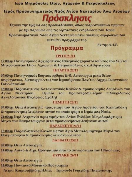 Πανηγυρίζει ο Ιερός Προσκυνηματικός Ναός Αγίου Νεκταρίου Άνω Λιοσίων, ο οποίος τελεί τις ακολουθίες σύμφωνα με το ιουλιανό εορτολόγιο.
