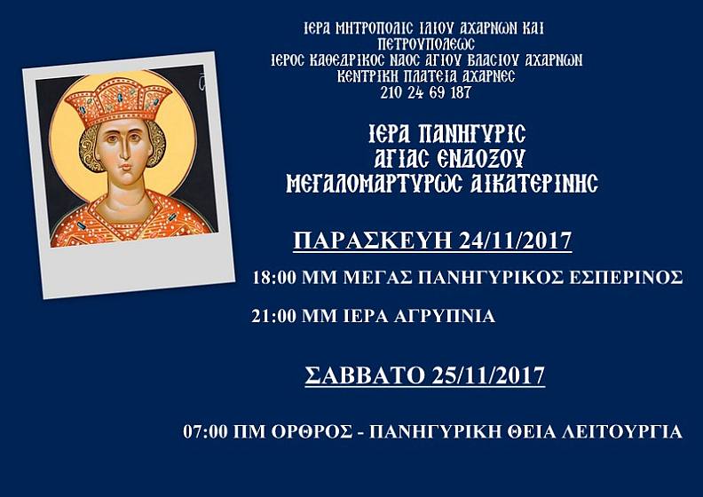 Η ενορία του Αγίου Βλασίου Αχαρνών πανηγυρίζει τη μνήμη της Αγίας Αικατερίνης της πανσόφου, στις 24 και 25 Νοεμβρίου 2017.