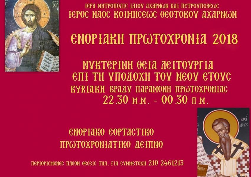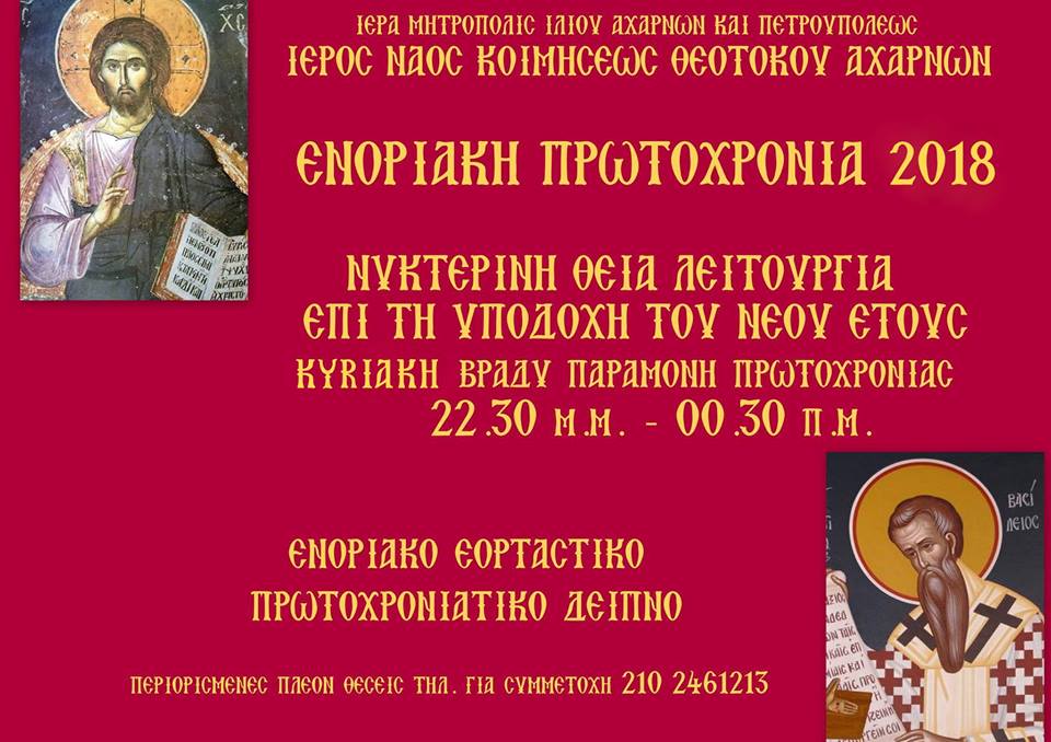 Την παραμονή της Πρωτοχρονιάς, Κυριακή 31 Δεκεμβρίου 2017, στον Ι.Ν. Κοιμήσεως Θεοτόκου Αχαρνών και ώρα 22.30 - 00.30 θα τελεσθεί βραδινή Θεία Λειτουργία επί τη υποδοχή του νέου έτους.