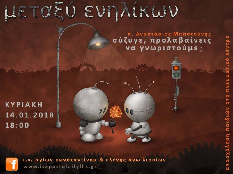 Την Κυριακή 14 Ιανουαρίου 2018 και ώρα 18:00 φιλοξενούμε στον Ι.Ν. Αγίων Κωνσταντίνου & Ελένης Άνω Λιοσίων τον π. Αναστάσιο Μπαστούνη, προϊστάμενο στον Μητροπολιτικό Ι.Ν. Ευαγγελιστρίας Ιλίου.
