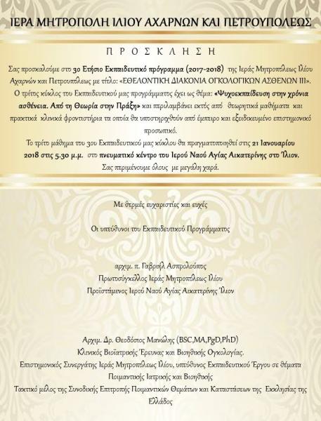 Στις 21 Ιανουαρίου 2018, στις 17:30, στο πνευματικό κέντρου του Ι.Ν. Αγ. Αικατερίνης Ιλίου θα πραγματοποιηθεί το επόμενο μάθημα του 3ου εκπαιδευτικού κύκλου του σεμιναρίου με τίτλο «Εθελοντική διακονία ογκολογικών ασθενών» και ειδικό θέμα «Ψυχοεκπαίδευση στη χρόνια ασθένεια. Από τη θεωρία στην πράξη».