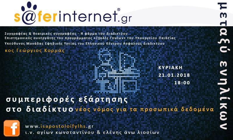 Την Κυριακή 21 Ιανουαρίου 2018 και ώρα 18:00 φιλοξενούμε στον Ι.Ν. Αγίων Κωνσταντίνου & Ελένης Άνω Λιοσίων, στο πλαίσιο της δράσης ΜΕΤΑΞΥ ΕΝΗΛΙΚΩΝ, τον κο Γεώργιο Κορμά, υπεύθυνο της γραμμής Βοηθείας ΥποΣΤΗΡΙΖΩ 80011-80015 της Μονάδας Εφηβικής Υγείας του Ελληνικού Κέντρου Ασφαλούς Διαδικτύου – Safer Internet, συντονιστή του προγράμματος Ε.Σ.Π.Α. της Διεύθυνσης Ψυχικής Υγείας του Υπουργείου Υγείας “ΑΡΙΑΔΝΗ: Πρόγραμμα Κατάρτισης 1000 Επαγγελματιών Ψυχικής Υγείας για το φαινόμενο του «εθισμού» των εφήβων στο διαδίκτυο”, επιστημονικό συνεργάτη του προγράμματος «Σχολές Γονέων» του Υπουργείου Παιδείας, συγγραφέα του βιβλίου «Σύγχρονος Ιατρικός & Ψυχολογικός Οδηγός για Παιδιά και Εφήβους» και του παραμυθιού / θεατρικού έργου «Η φάρμα του Διαδικτύου», επιμελητή των εκδόσεων «Διαδίκτυο και Εφηβεία» και «Συμπεριφορές εξάρτησης στο Διαδίκτυο» στο πλαίσιο του Προγράμματος «Αριάδνη». Το θέμα της ομιλίας / συζήτησης είναι"Συμπεριφορές εξάρτησης στο διαδίκτυο, νέος νόμος για τα προσωπικά δεδομένα".