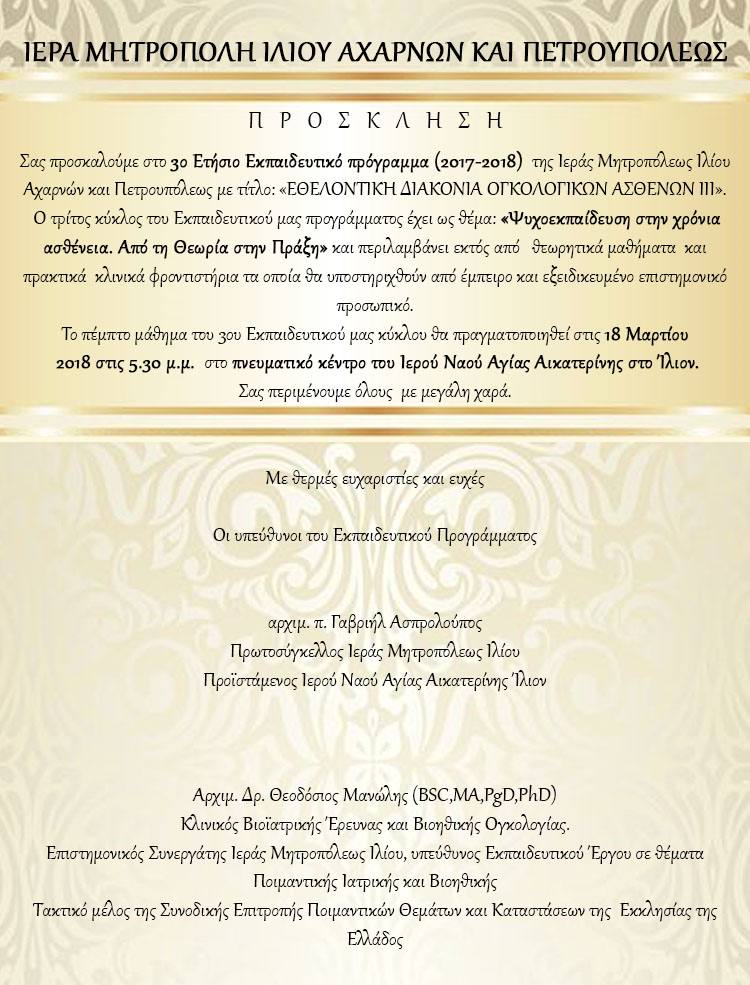 Το πέμπτο μάθημα του Γ' εκπαιδευτικού κύκλου του σεμιναρίου με γενικό τίτλο «Εθελοντική διακονία ογκολογικών ασθενών» θα πραγματοποιηθεί την Κυριακή 18 Μαρτίου 2018, στις 17:30.