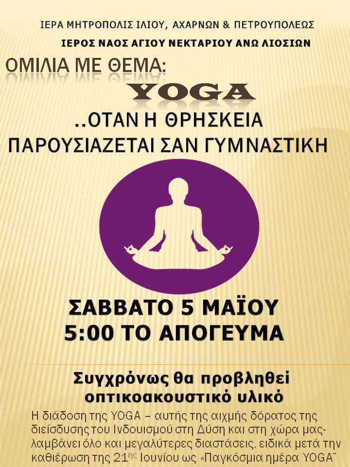 Ομιλία με θέμα «Yoga... Όταν η θρησκεία παρουσιάζεται ως γυμναστική» θα πραγματοποιηθεί στο Ι. Μητροπολιτικό Παρεκκλήσιο του Αγίου Νεκταρίου Άνω Λιοσίων.