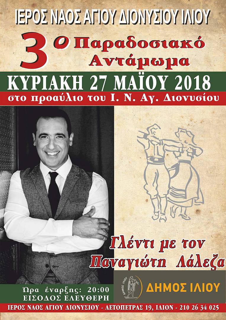 Το 3ο παραδοσιακό αντάμωμα διοργανώνεται στο προαύλιο του Ιερού Ναού Αγίου Διονυσίου Ιλίου την Κυριακή 27 Μαΐου 2018, στις 8 το βράδυ.