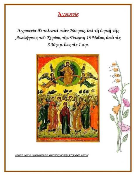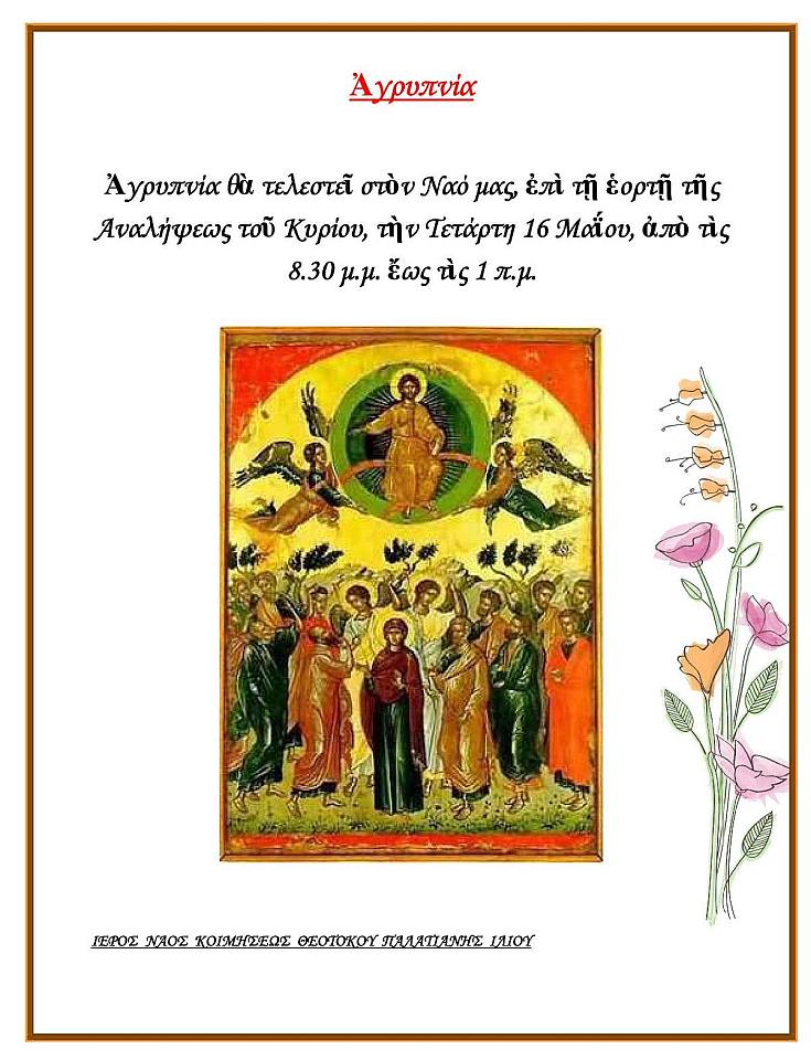 Αγρυπνία θα τελεστεί στον Ι.Ν. Κοιμήσεως Θεοτόκου Παλατιανής Ιλίου, επί τη εορτή της Αναλήψεως του Κυρίου, την Τετάρτη 16 Μαΐου 2018, από τις 20:30 ως τη 1 π.μ.