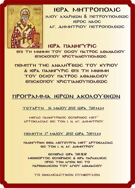 19:00  Μεθέορτος εσπερινός και ιερά παράκλησις προς τον άγιο Αθανάσιο (στο παρεκκλήσιο του Αγίου Αθανασίου)