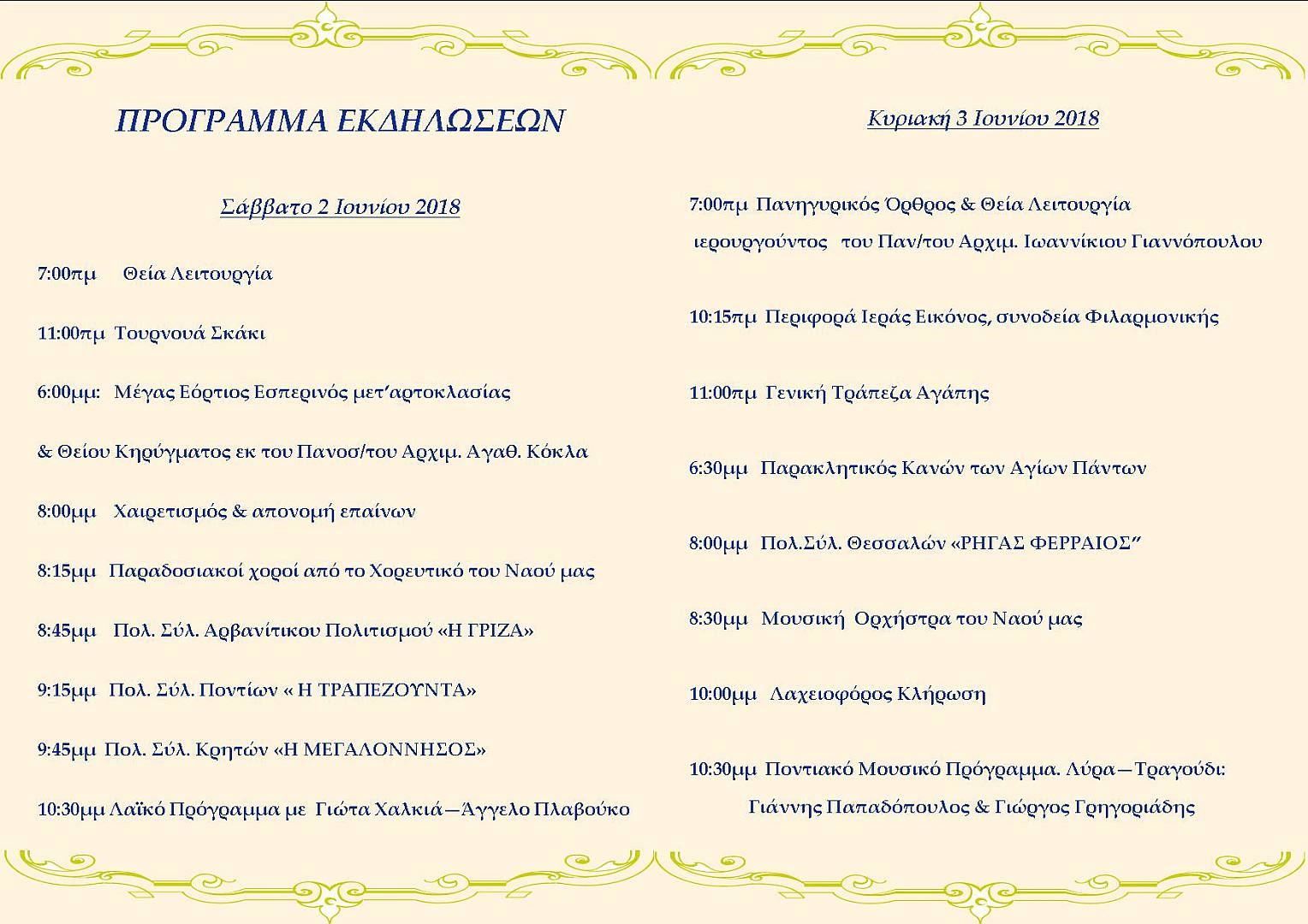 Στο προαύλιο του ναού θα πραγματοποιηθούν και τις δύο ημέρες πολιτιστικές εκδηλώσεις, όπως φαίνονται στο πρόγραμμα.