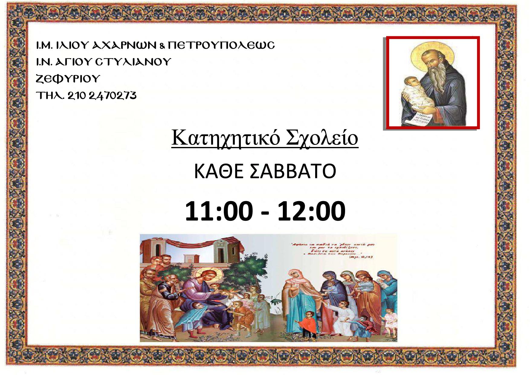 Ξεκινώντας από το Σάββατο 29 Σεπτεμβρίου 2018 και κάθε Σάββατο, από 11:00 μέχρι 12:00 το μεσημέρι, θα γίνονται οι κατηχητικές συνάξεις της ενορίας.
