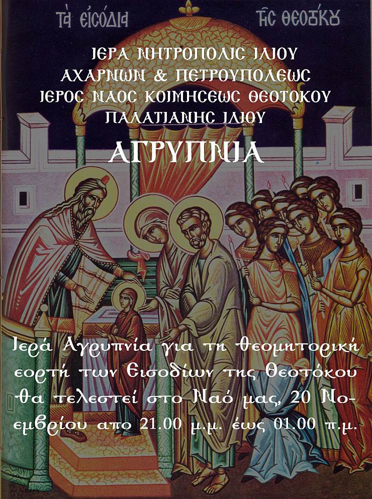 Ο Ιερός Ναός Κοιμήσεως Θεοτόκου Παλατιανής Ιλίου τιμά και πανηγυρίζει την εν τω Ναώ Είσοδο της Υπεραγίας Θεοτόκου.