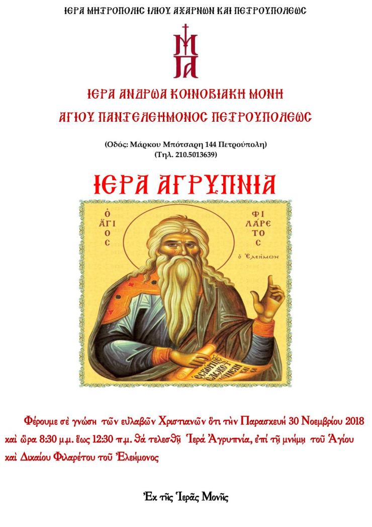 Φέρουμε εις γνώση των ευλαβών χριστιανών ότι την Παρασκευή 30 Νοεμβρίου 2018 και από ώρας 20:30 έως 00:30, θα τελεστεί Ιερά Αγρυπνία επί τη μνήμη του Αγίου και Δικαίου Φιλαρέτου του Ελεήμονος, στην Ι.Μ. Αγίου Παντελεήμονος (Μ. Μπότσαρη 144, Πετρούπολη, πλησίον Ι.Ν. Κοιμήσεως Θεοτόκου).