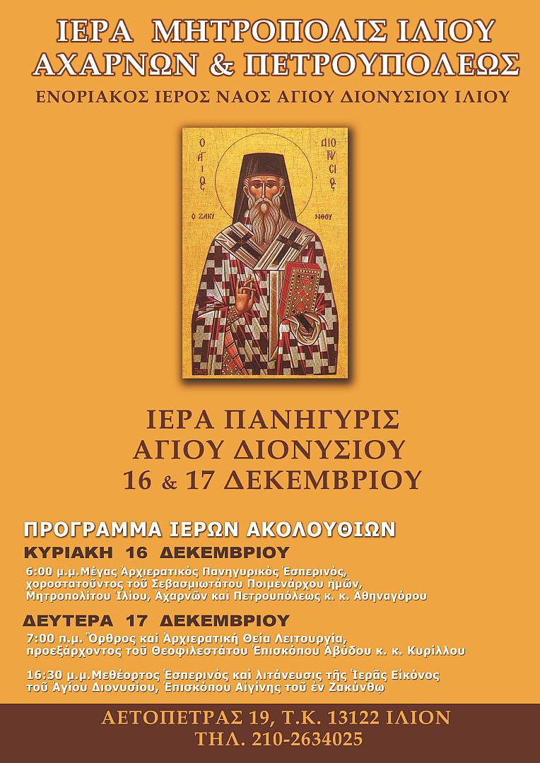Το πρόγραμμα της πανηγύρεως του Ι.Ν. Αγίου Διονυσίου Ιλίου είναι το ακόλουθο: