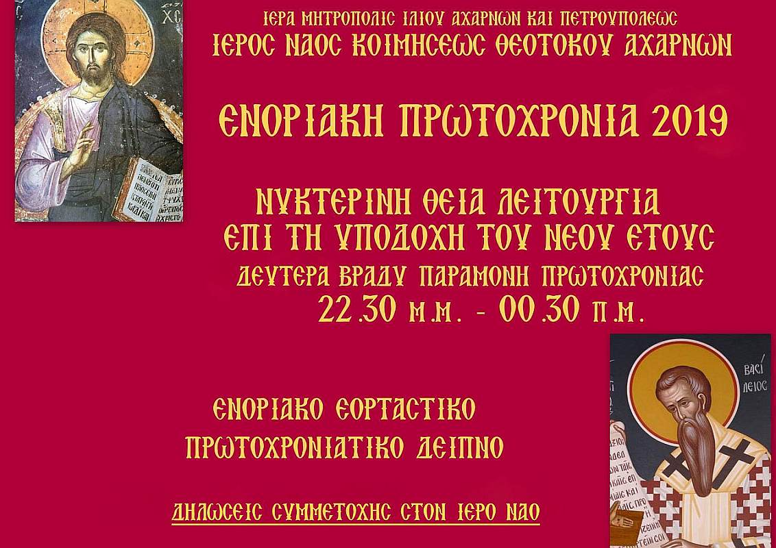 Νυχτερινή Θεία Λειτουργία επί τη υποδοχή του νέου έτους, τη Δευτέρα 31/12/2018, από τις 22:30 το βράδυ μέχρι μισή ώρα μετά τα μεσάνυχτα.