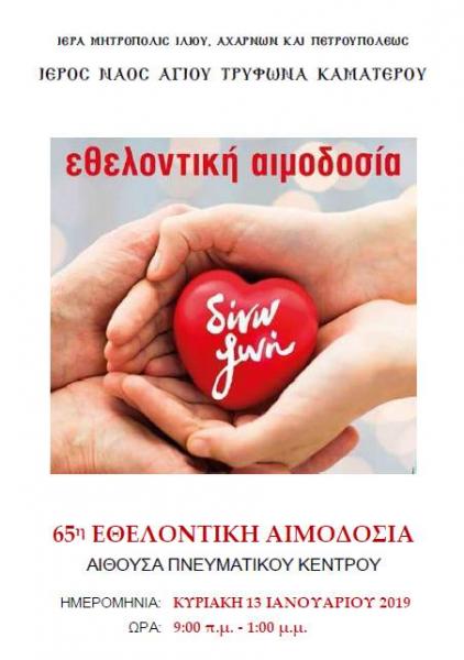 O Ι. Ν. Αγίου Τρύφωνος Καματερού διοργανώνει την Kυριακή 13 Ιανουαρίου 2019, από τις 9 π.μ έως τη 1 μ.μ., την 65η εθελοντική αιμοδοσία στο πνευματικό κέντρο του Ιερού Ναού (Τεπελενίου και Αριστείδου γωνία).