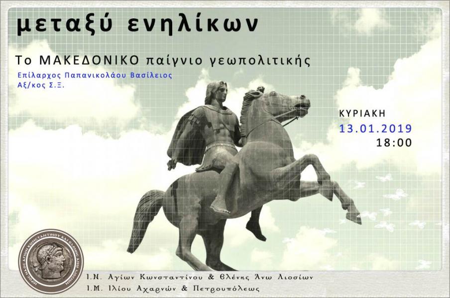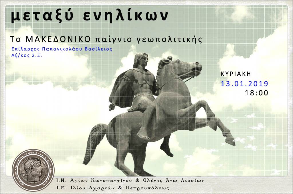 Φιλοξενούμε στον Ι.Ν. Αγίων Κωνσταντίνου & Ελένης Άνω Λιοσίων (δράση ΜΕΤΑΞΥ ΕΝΗΛΙΚΩΝ) τον Επίλαρχο Παπανικολάου Βασίλειο, Αξιωματικό Στρατού Ξηράς. Το θέμα της ομιλίας είναι «Το Μακεδονικό παιγνίο γεωπολιτικής». Κάθε θέμα που προβληματίζει την ελληνική οικογένεια βρίσκει τη θέση του στο Μεταξύ Ενηλίκων, όπως αρμόζει στην εκκλησία. Με σύνεση, φρονιμάδα, προσευχή μα και γνώση.