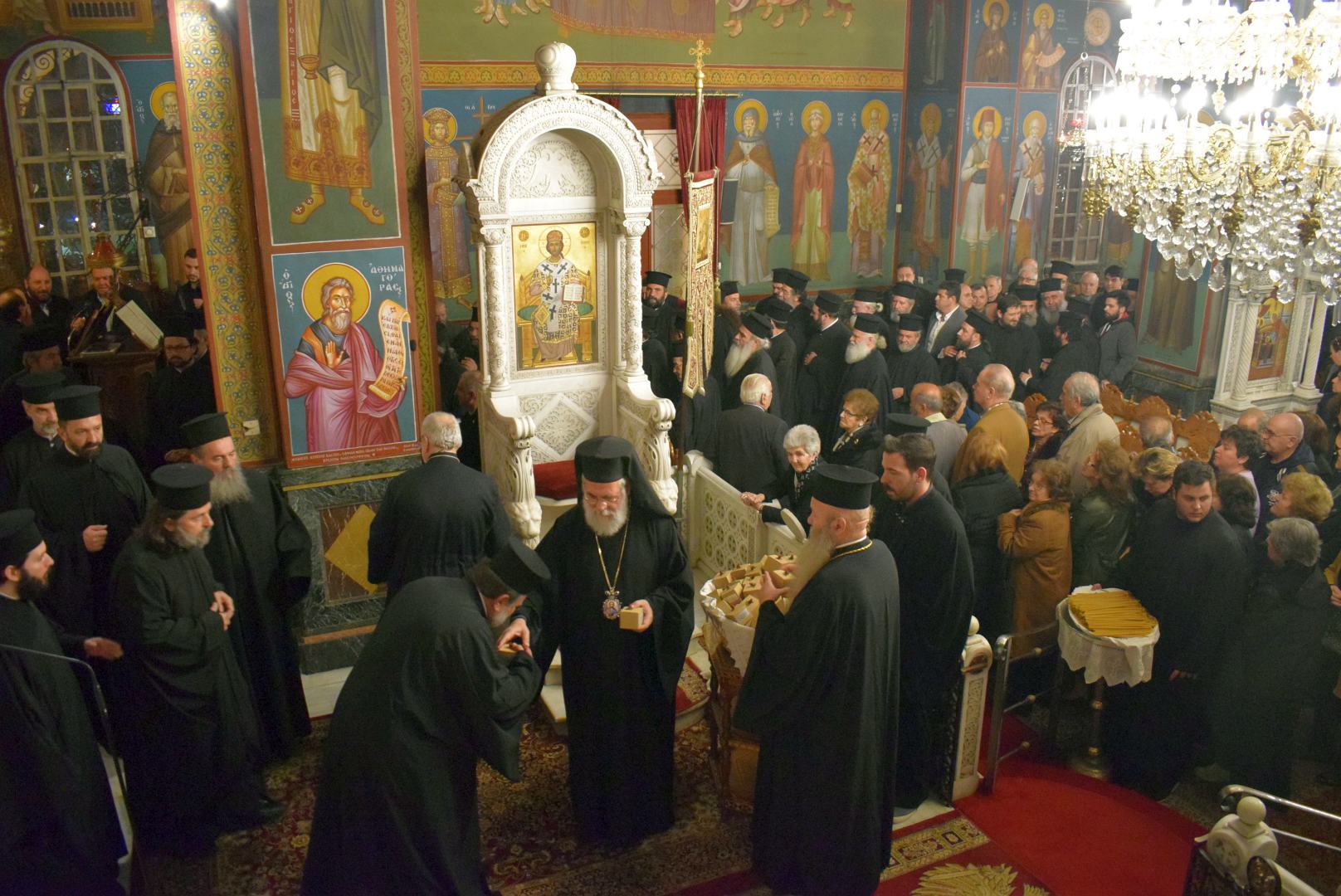 Στο τέλος, αντάλλαξε τον ασπασμό της συγχώρησης με όλους του ιερείς της Μητροπόλεως και τους πιστούς που είχαν προσέλθει από πολλές ενορίες, δίνοντάς τους ως ευλογία ένα κηροπήγιο και ένα μελισσοκέρι, για την προσευχή τους κατά την περίοδο αυτή.