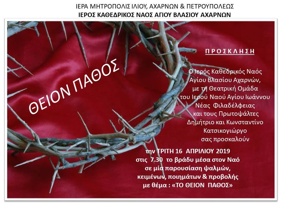 Ο Ιερός Καθεδρικός Ναός Αγίου Βλασίου Αχαρνών, με τη θεατρική ομάδα του Ι. Ναού Αγίου Ιωάννου Νέας Φιλαδέλφειας και τους πρωτοψάλτες Δημήτριο και Κωνσταντίνο Κατσικογιώργο σας προσκαλούν την Τρίτη 16 Απριλίου 2019 στις 7:30 το βράδυ σε μία παρουσίαση ψαλμών, κειμένων, ποιημάτων και προβολής με θέμα «Το Θείον Πάθος».