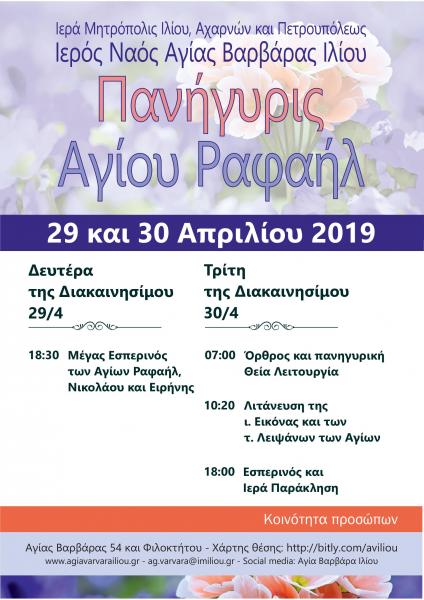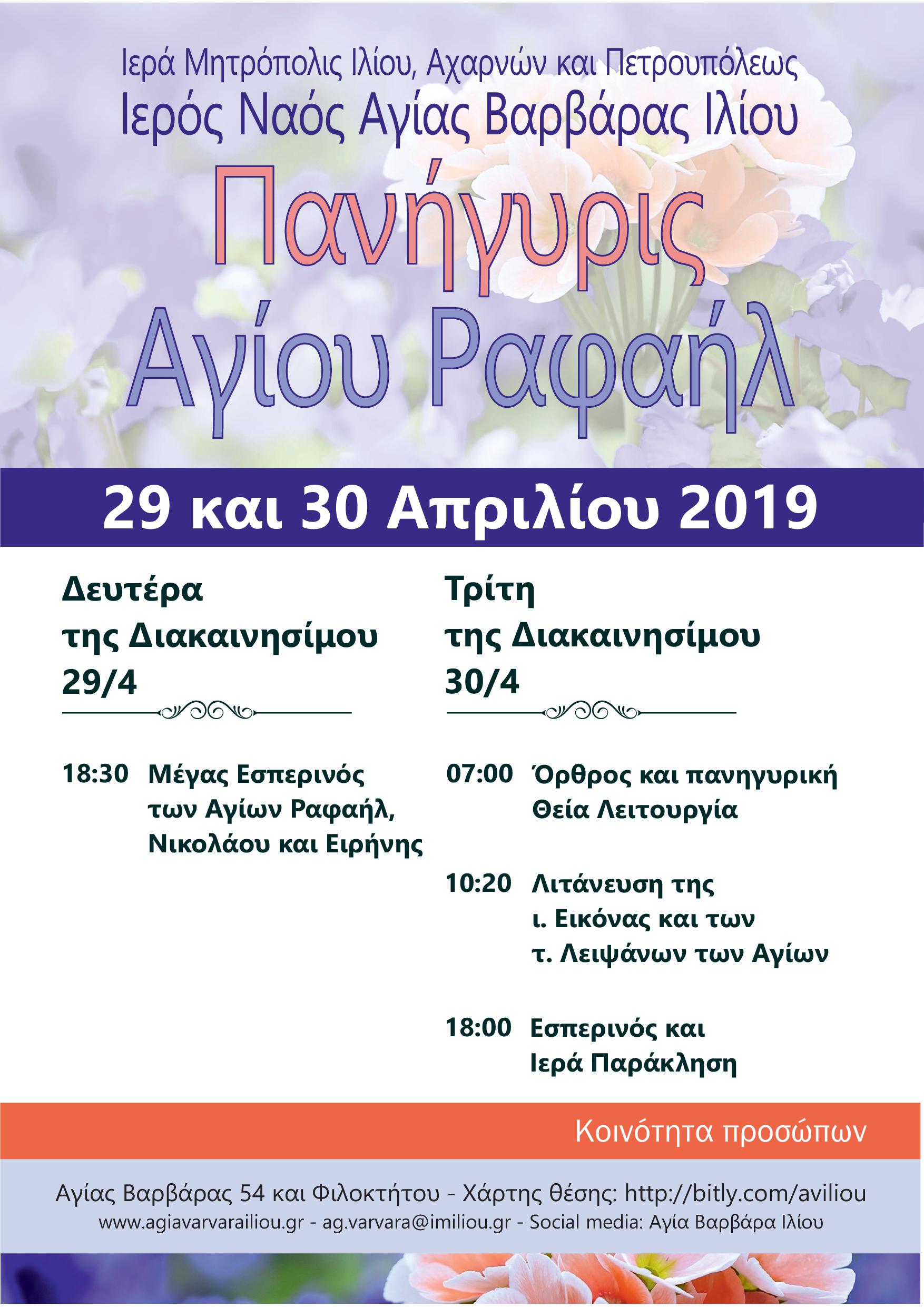 Την Τρίτη της Διακαινησίμου τελείται η Πανήγυρις του Αγίου Ραφαήλ, δεύτερου προστάτου της ενορίας της Αγίας Βαρβάρας.