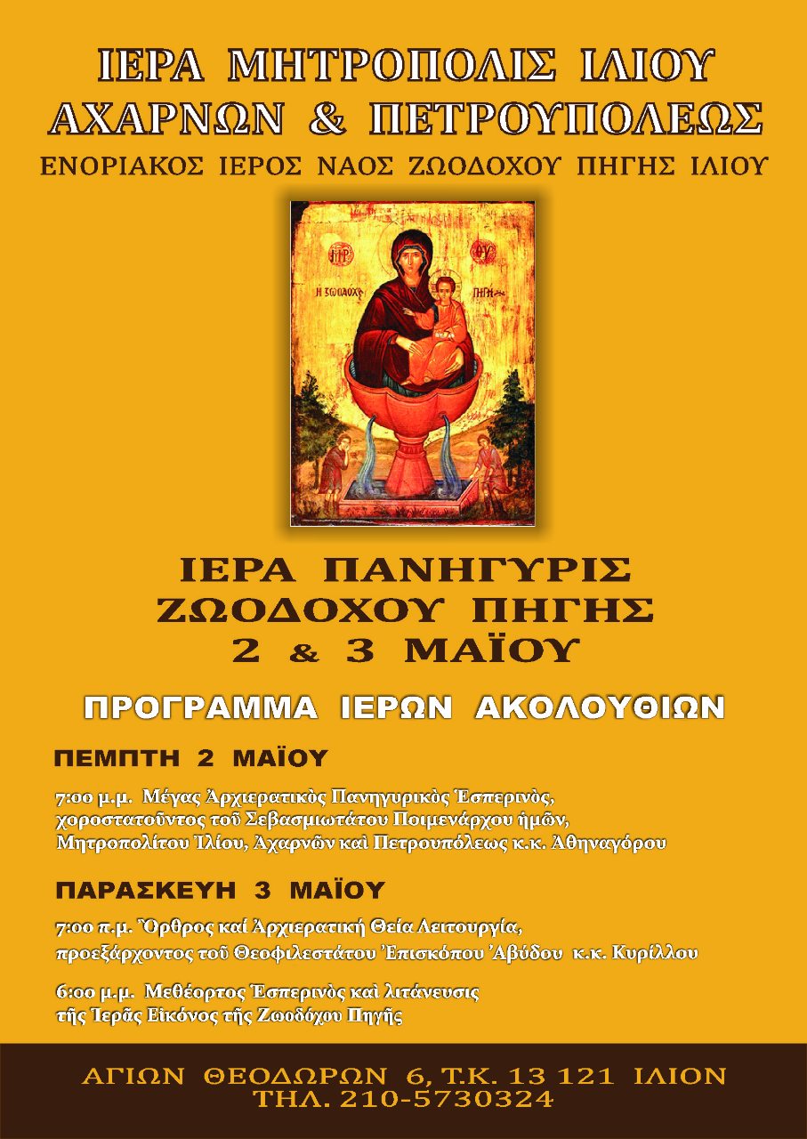 Πανηγυρίζει ο Ιερός Ναός Ζωοδόχου Πηγής Ιλίου, την Παρασκευή της Διακαινησίμου, σύμφωνα με το εξής πρόγραμμα: