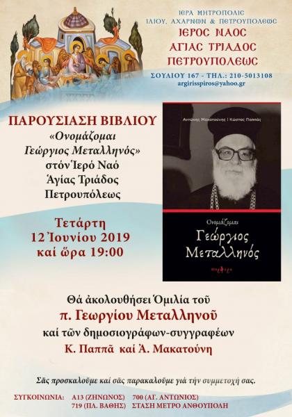 Το βιβλίο με τίτλο «Ονομάζομαι Γεώργιος Μεταλληνός» θα παρουσιαστεί στον Ι.Ν. Αγ. Τριάδος Πετρουπόλεως, την Τετάρτη 12 Ιουνίου 2019, στις 7 μ.μ.