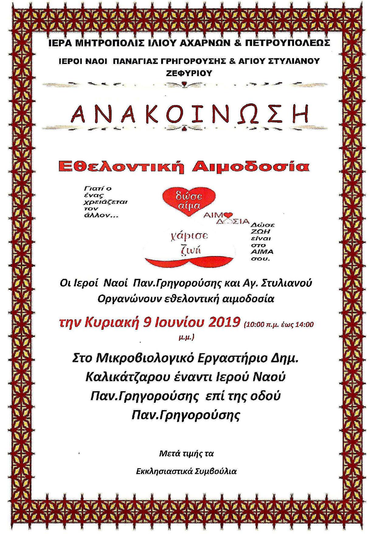 Την Κυριακή 9 Ιουνίου 2019, από 10꞉00 ως 14꞉00, μετά τη Θεία Λειτουργία, η ενορία Παναγίας Γρηγορούσης και η ενορία Αγίου Στυλιανού Ζεφυρίου οργανώνουν εθελοντική αιμοδοσία, σε συνεργασία με το Γενικό Νοσοκομείο Νοσημάτων Θώρακος «Η ΣΩΤΗΡΊΑ».