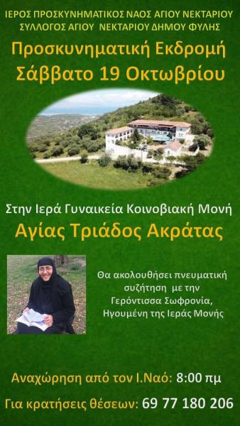 Ο Ιερός Προσκυνηματικός Ναός Αγίου Νεκταρίου Άνω Λιοσίων πραγματοποιεί προσκυνηματική εκδρομή στην Ιερά Κοινοβιακή Μονή Αγίας Τριάδας Ακράτας, το Σάββατο 19 Οκτωβρίου 2019.