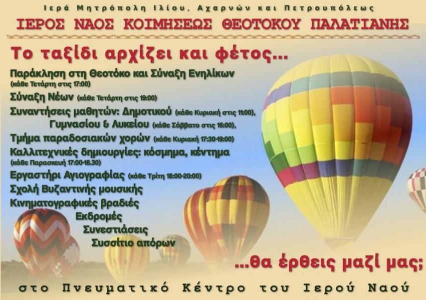 Στο Πνευματικό Κέντρο του Ι.Ν. Κοιμήσεως Θεοτόκου Παλατιανής Ιλίου πραγματοποιούνται οι εξής δραστηριότητες: