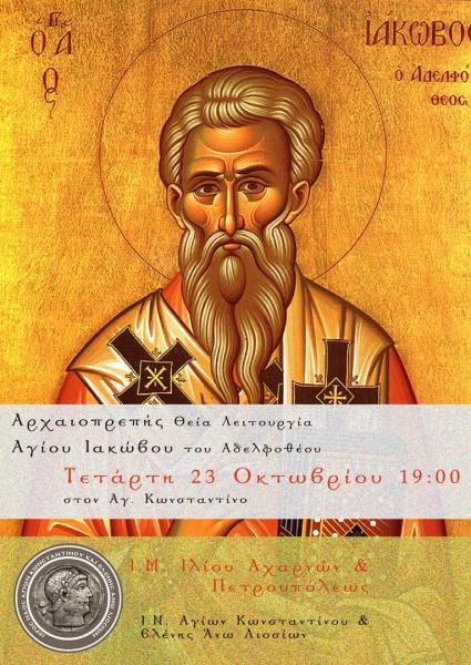 Αρχαιοπρεπής Θεία Λειτουργία του Αγίου Ιακώβου του Αδελφοθέου θα τελεστεί την Τετάρτη 23 Οκτωβρίου 2019, στις 19:00, στον Ι.Ν. Αγίων Κωνσταντίνου και Ελένης Άνω Λιοσίων.