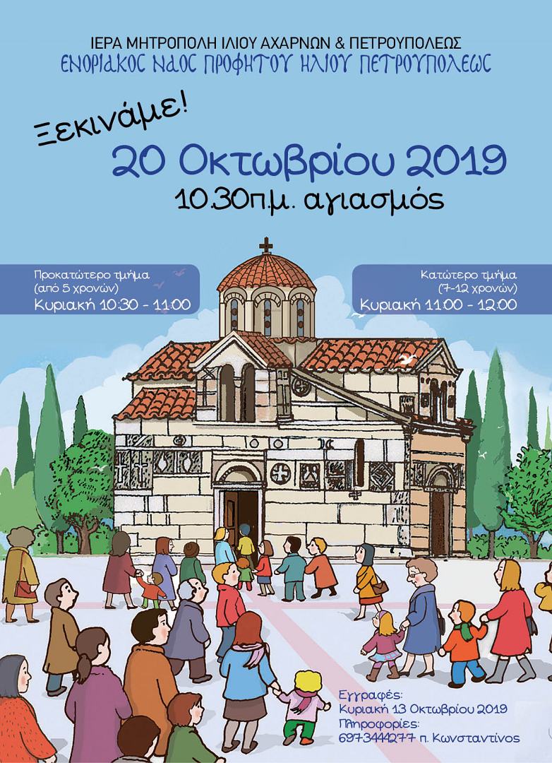 Την Κυριακή 20 Οκτωβρίου 2019 ξεκινούν οι κατηχητικές συνάξεις στον Ι.Ν. Προφήτου Ηλιού Πετρουπόλεως, με τον αγιασμό στις 10:30.