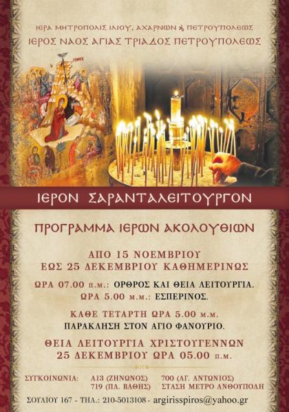 Δείτε το πρόγραμμα των ακολουθιών κατά την περίοδο του Σαρανταλείτουργου στον Ι.Ν. Αγίας Τριάδας Πετρουπόλεως.