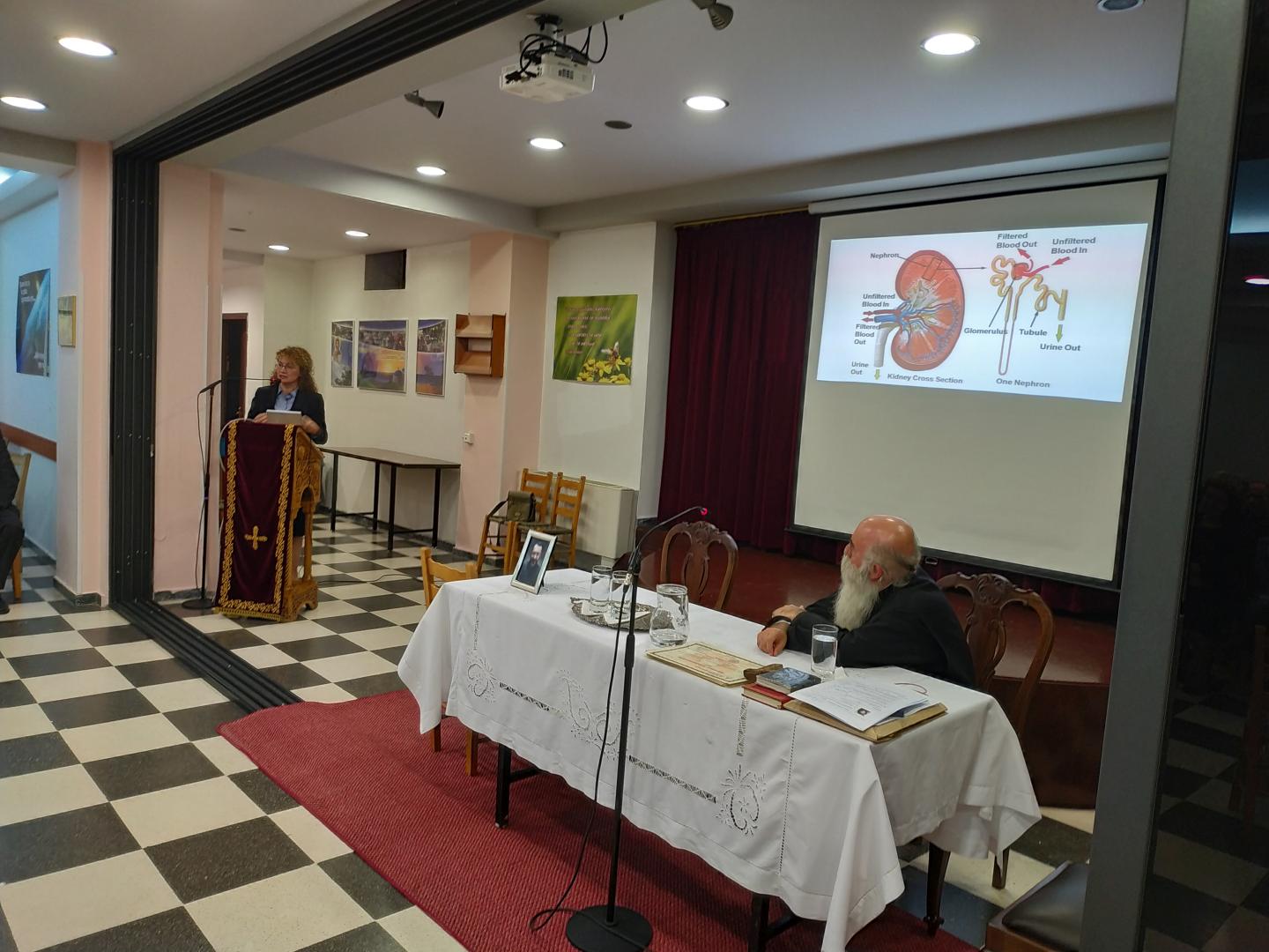 Μετά τον αγιασμό για την έναρξη της νέας περιόδου στο σεμινάριο εθελοντικής διακονίας νοσηλευομένων ασθενών, έλαβε το λόγο η προσκεκλημένη ομιλήτρια, η Ερίτιμος κυρία ΛΙΟΝΑΚΗ ΣΟΦΙΑ, ιατρός Νεφρολόγος, Επιμελήτρια Β' της Νεφρολογικής Κλινικής του Λαϊκού Νοσοκομείου Αθηνών, και μίλησε για την: «Χρόνια Νεφρική Νόσο: εξωνεφρική κάθαρση».