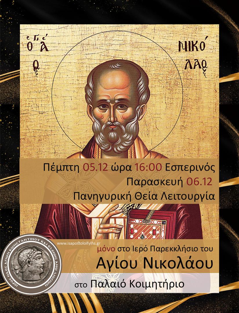 Ακολουθεί το πρόγραμμα ακολουθιών του Ιερού Κοιμητηριακού Παρεκκλησίου Αγίου Νικολάου, στο Παλαιό Κοιμητήριο Άνω Λιοσίων, κατά την πανήγυρη της 6ης Δεκεμβρίου 2019.