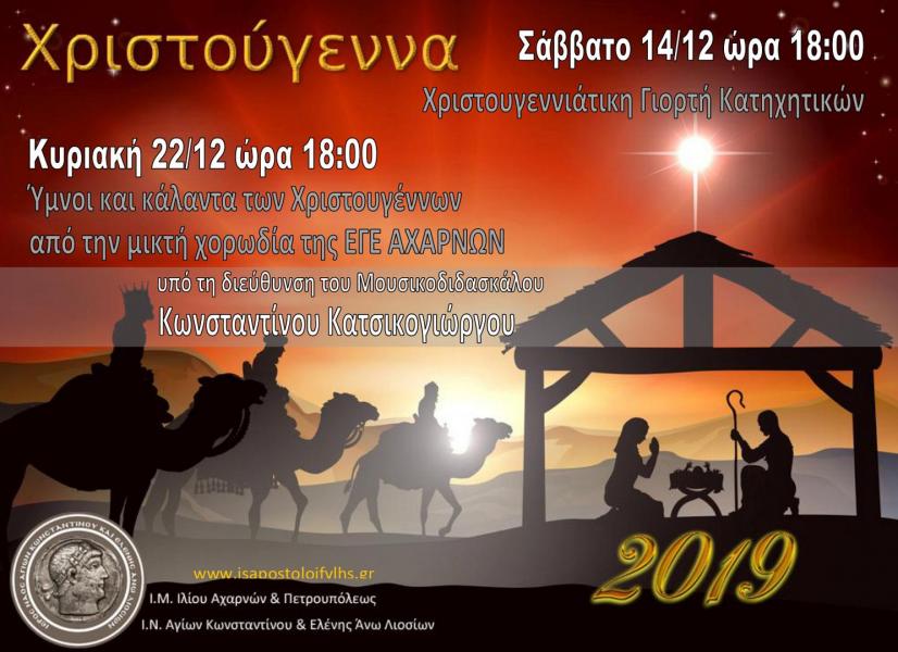 Την Κυριακή 22 Δεκεμβρίου 2019 και ώρα 18:00 θα χαρούμε ύμνους και κάλαντα των Χριστουγέννων από τη μικτή χορωδία της ΕΓΕ ΑΧΑΡΝΩΝ υπό τη διεύθυνση του μουσικοδιδασκάλου κου Κωνσταντίνου Κατσικογιώργου.