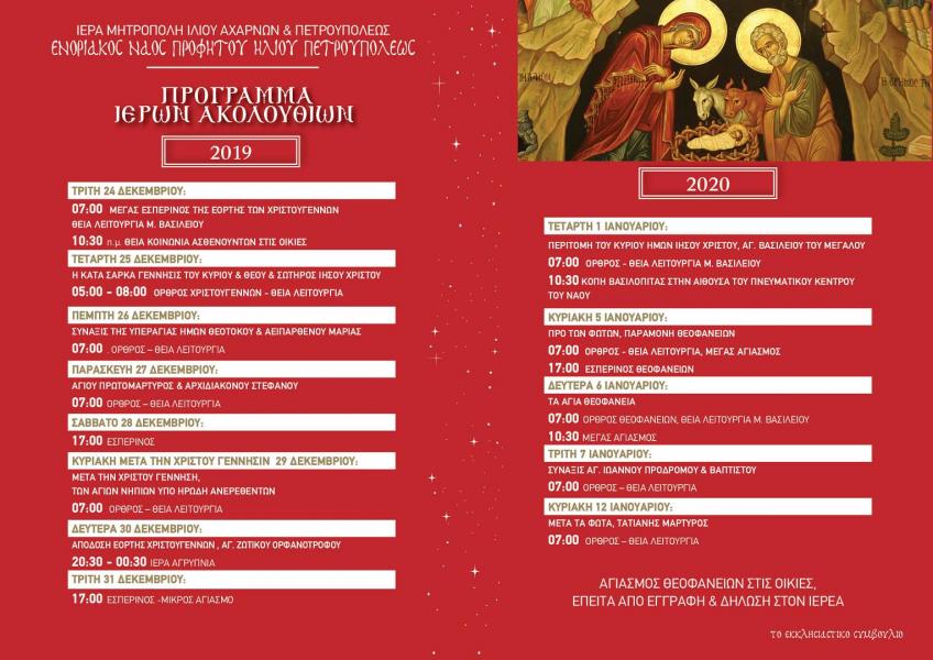 Δείτε το πρόγραμμα ακολουθιών του Ι.Ν. Προφήτη Ηλία Πετρουπόλεως για το άγιο Δωδεκαήμερο 2019-2020.