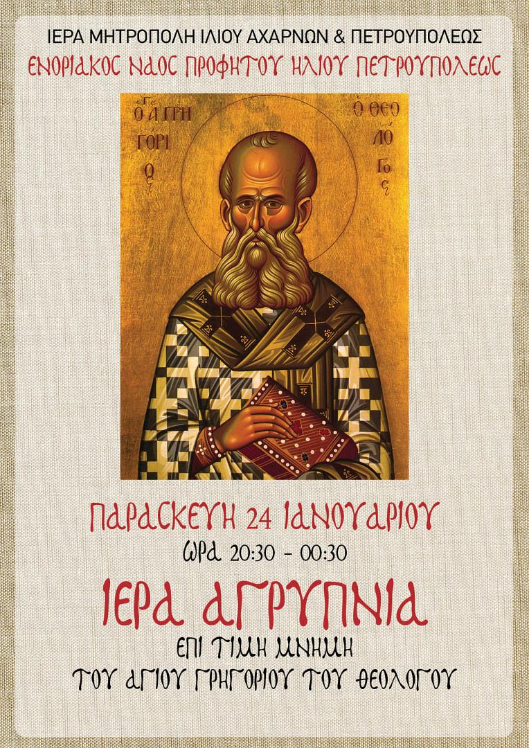 Ιερά Αγρυπνία θα τελεστεί στον Ιερό Ναό Προφήτου Ηλιού Πετρουπόλεως, επί τη μνήμη του Αγίου Γρηγορίου του Θεολόγου, την Παρασκευή 24 Ιανουαρίου 2020, από τις 20:30 ως τις 00:30 περίπου.
