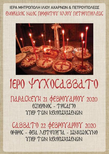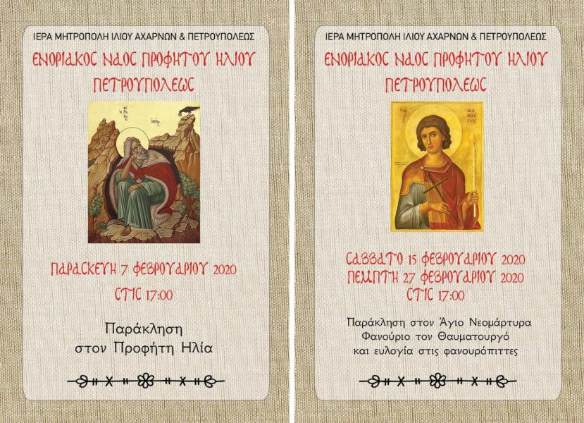 Δείτε ιερές ακολουθίες και δραστηριότητες που θα πραγματοποιηθούν εντός του Φεβρουαρίου 2020, στον Ιερό Ναό Προφήτου Ηλιού Πετρ.