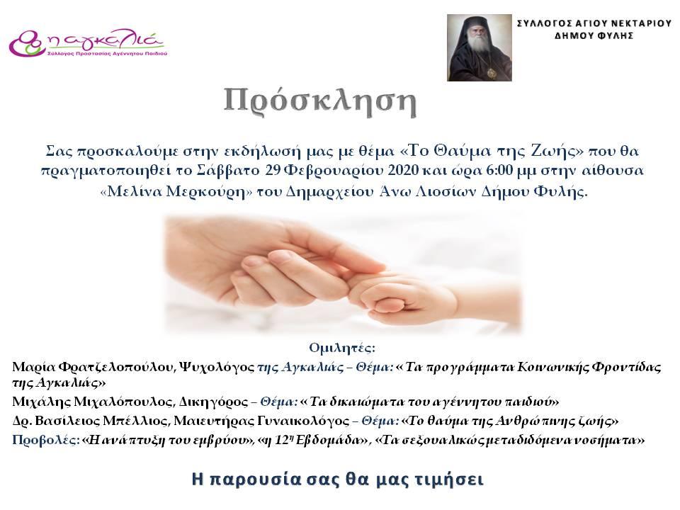 Σας προσκαλούμε στην εκδήλωση του Συλλόγου Αγίου Νεκταρίου Δήμου Φυλής, σε συνεργασία με τον Σύλλογο Προστασίας Αγέννητου Παιδιού «η αγκαλιά», με θέμα «το θαύμα της ζωής».
