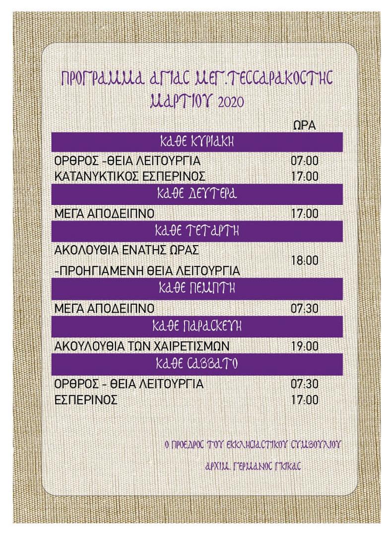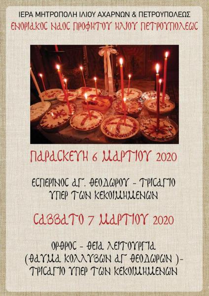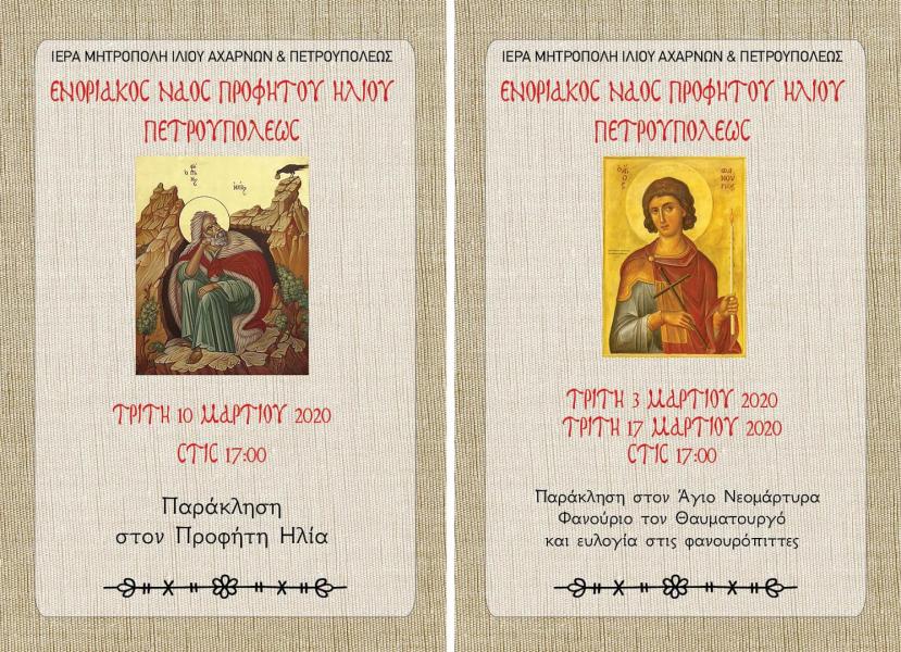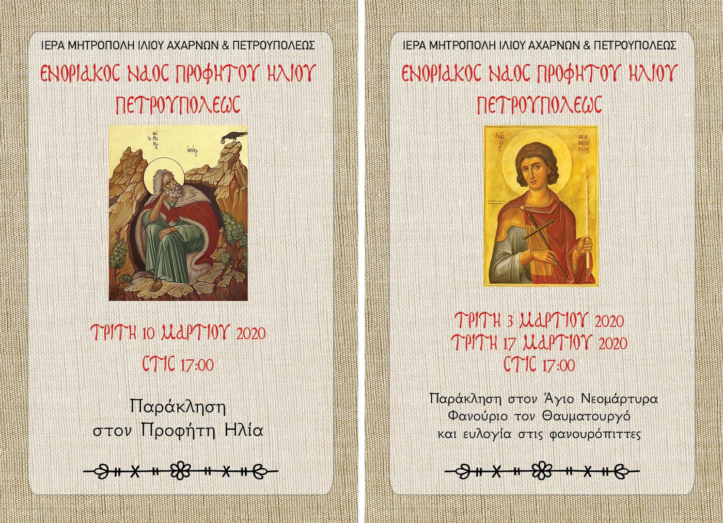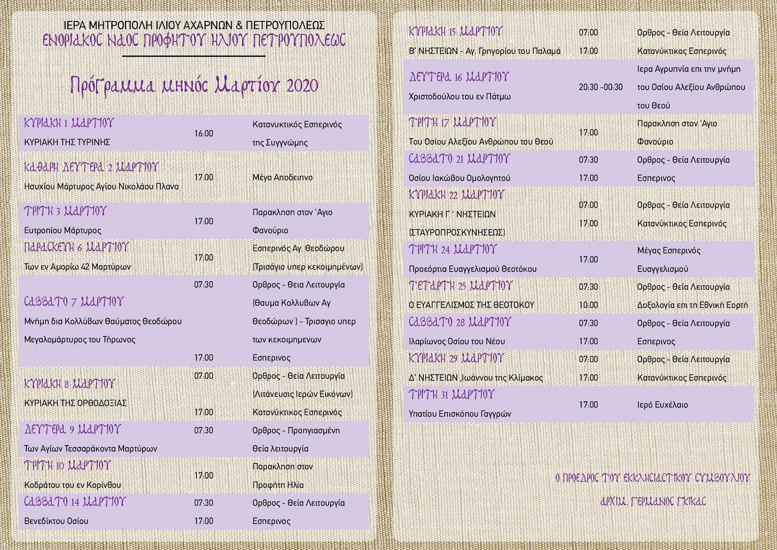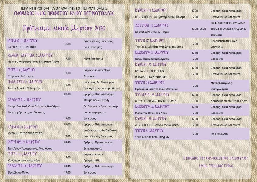 Πρόγραμμα ακολουθιών Μαρτίου 2020 στον Προφ. Ηλία Πετρ.