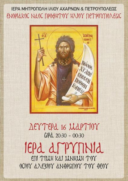 Σημειώνεται η Ιερά Αγρυπνία που θα τελεστεί την 16η Μαρτίου, επί τη μνήμη του Αγίου Αλεξίου, του ανθρώπου του Θεού, από 20:30 ως 00:30.