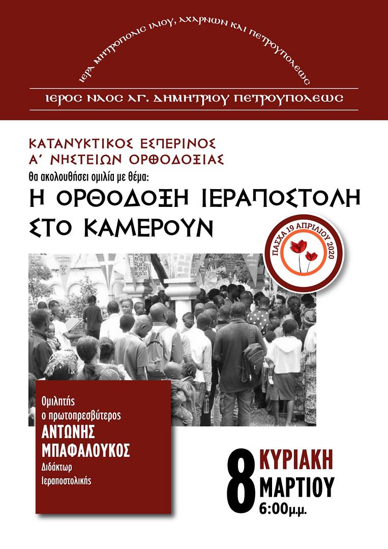 Θα ακολουθήσει ομιλία με θέμα «Η ορθόδοξη ιεραποστολή στο Καμερούν» και παράλληλα θα προβληθεί σχετικό φωτογραφικό υλικό. Ομιλητής θα είναι ο πρωτοπρεσβύτερος Αντώνιος Μπαφαλούκος, διδάκτωρ Ιεραποστολής.
