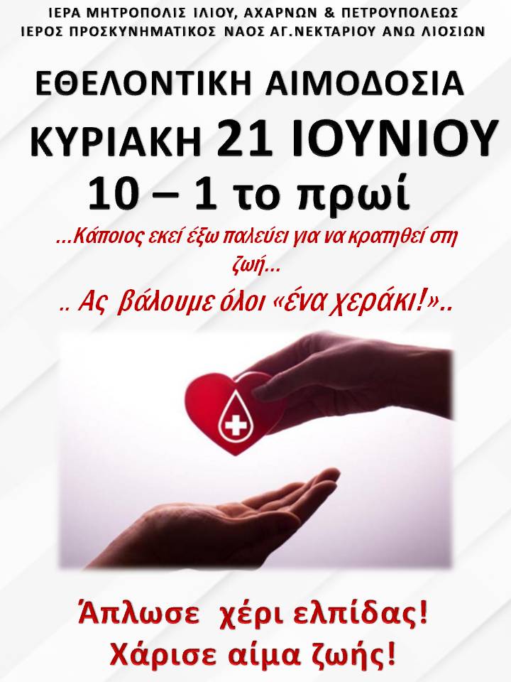 Εθελοντική αιμοδοσία θα πραγματοποιηθεί στον Ιερό Προσκυνηματικό Ναό Αγίου Νεκταρίου Άνω Λιοσίων, την Κυριακή 21 Ιουνίου 2020, από 10 π.μ. έως 1 μ.μ.